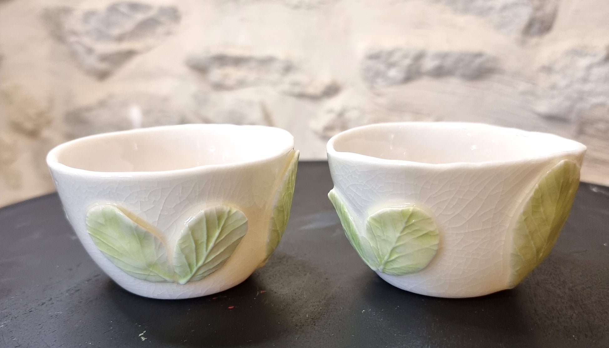 A set of 6 small tea bowls decorated with foliage and flowers in glazed porcelain. These bowls cannot be purchased individually.