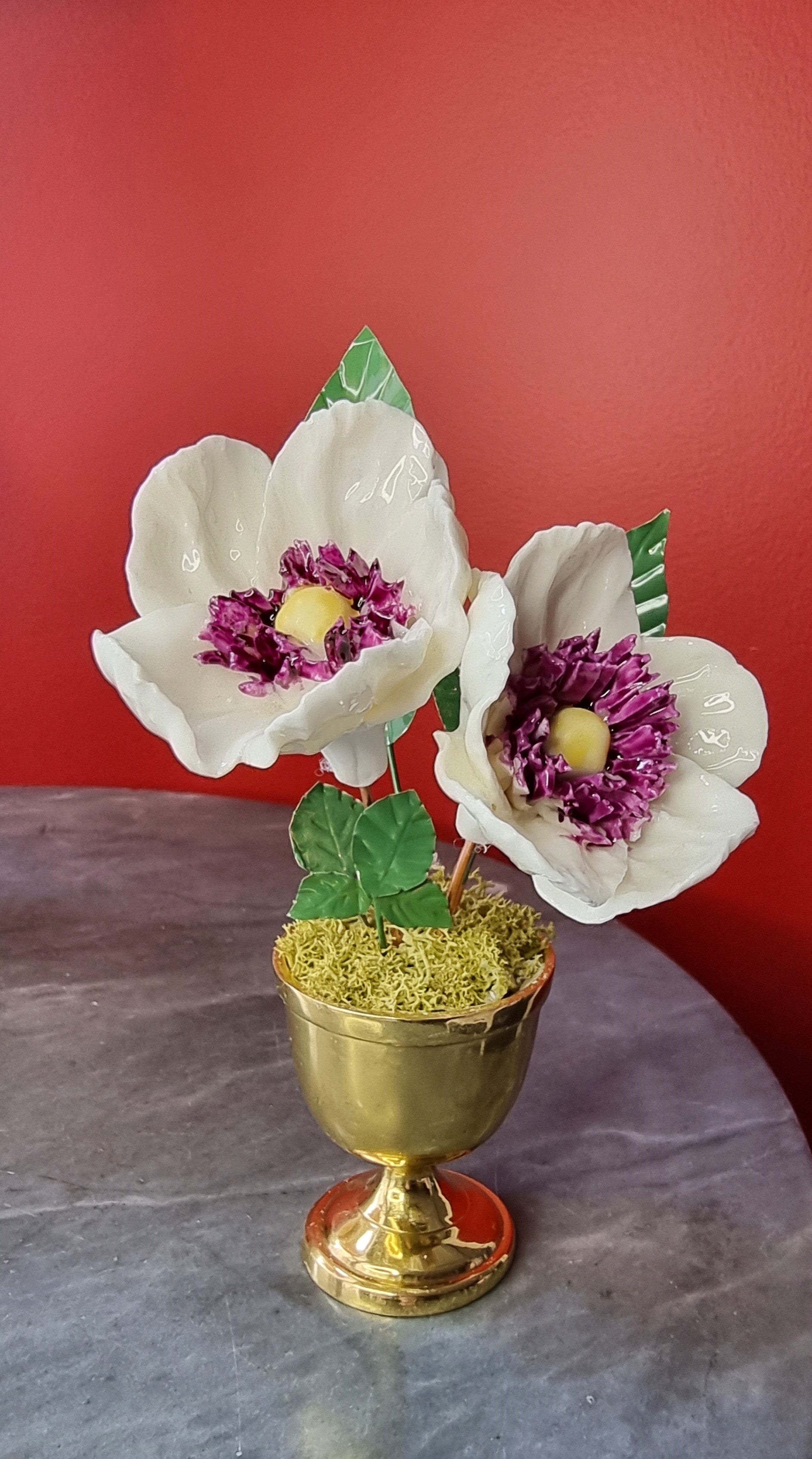 Painted copper foliage. Flowers set in a white glazed porcelain hemisphere.