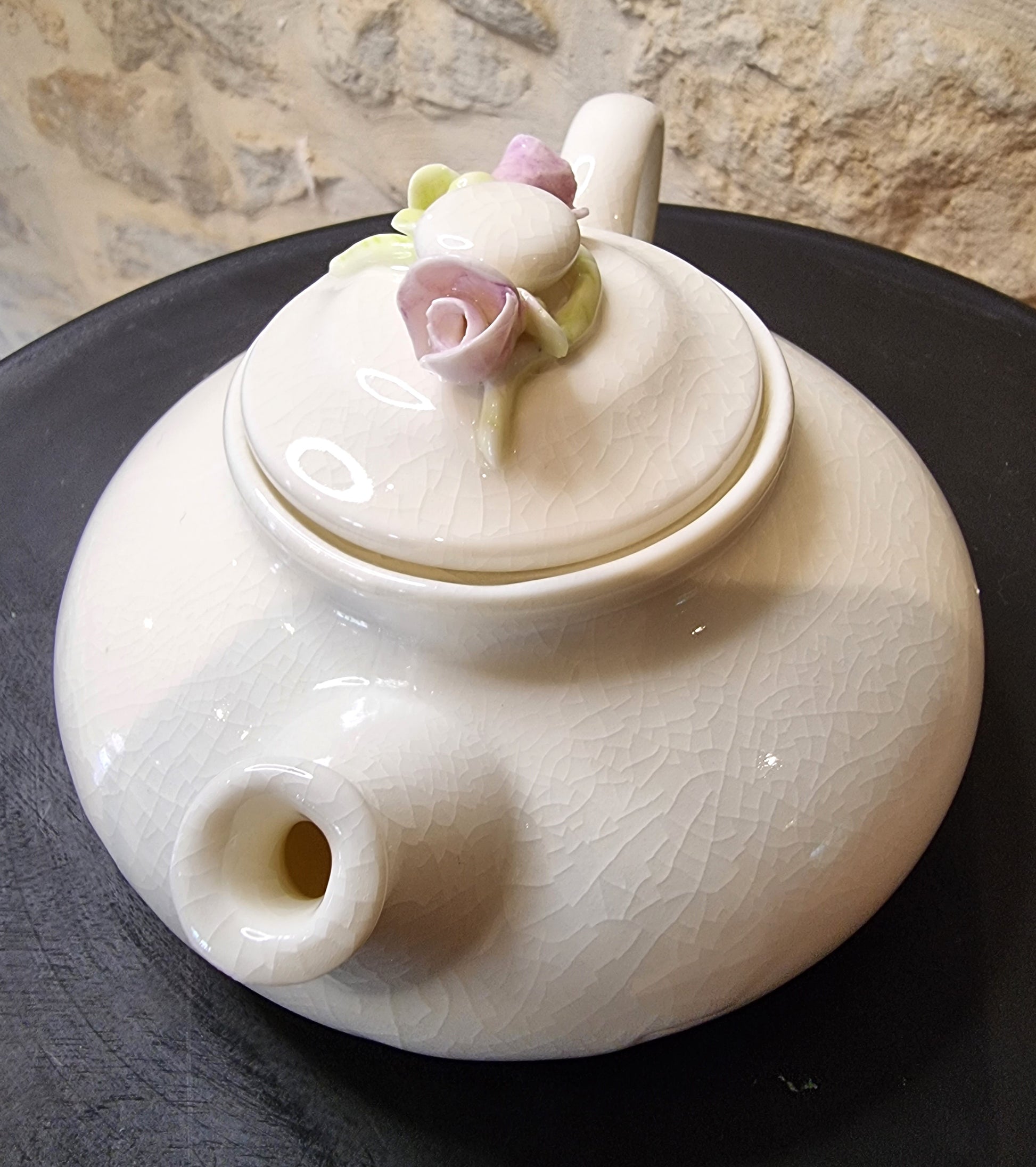 White glazed porcelain teapot. Lid decorated with glazed porcelain flowers and foliage.