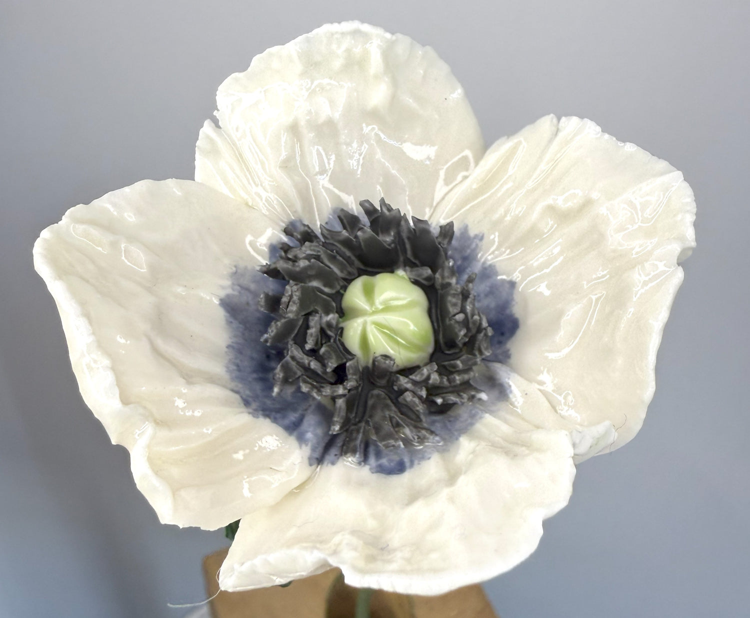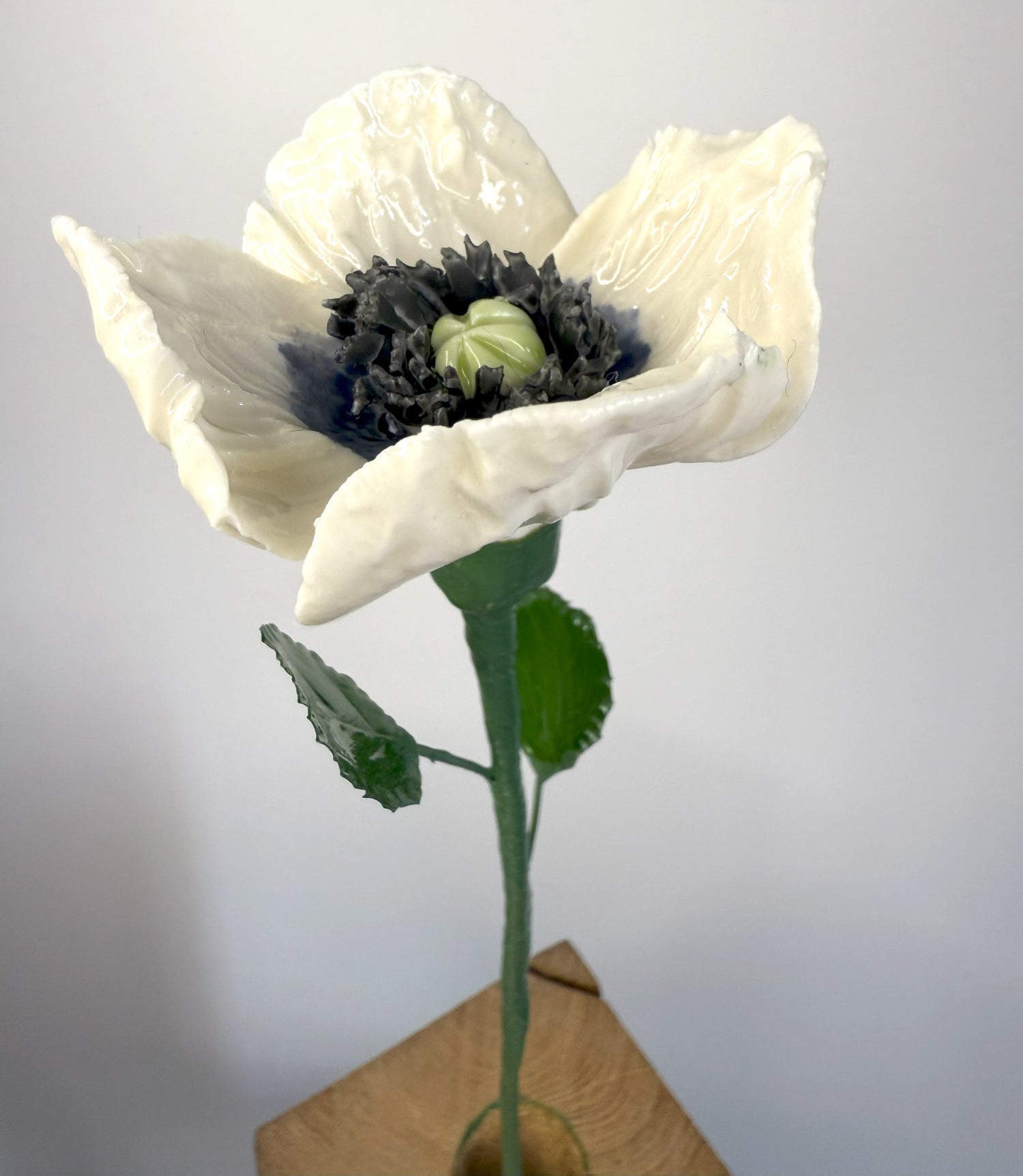 Petit pavot en porcelaine émaillée blanche, sculptée à la main. Un coeur vert clair, un pistil gris charbon entouré d'une collerette bleu ardoise. Montée sur tige avec feuillage en cuivre façonné, chaque fleur est une pièce unique. Entièrement fabriqué à la main dans notre atelier du Marais à Paris. Hauteur environ 45 cm fleur entre 5 et 7 cm.